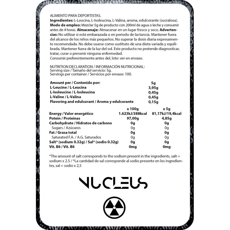 Bcaa's(aminoácidos ramificados) con ratio 8:1:1(L-Leucina, L-isoleucina y L-valina), ideales para la recuperación muscular.